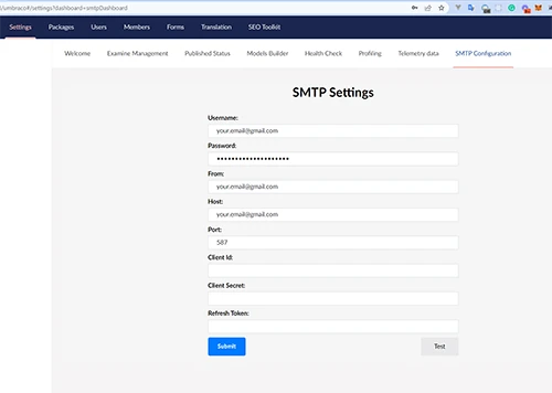 In this section you can configure your SMTP settings and submit them, using "Submit" button.